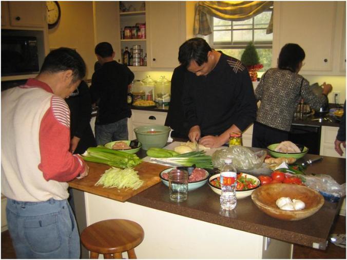 He brought four men and two women – Thomas, Charlie, Eric, Lee, Lily and Joyce. Joyce and Thomas had come with others in September and cooked. The group quickly made themselves at home. Thomas seemed very happy to see the woks that we had purchased.