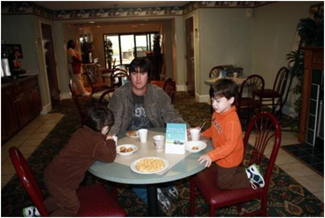 The twins enjoyed their stay at the Comfort Inn. They were especially excited about the continental breakfast. Josh fulfilled his responsibility as the milk monitor, avoiding any unnecessary messes.