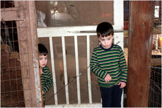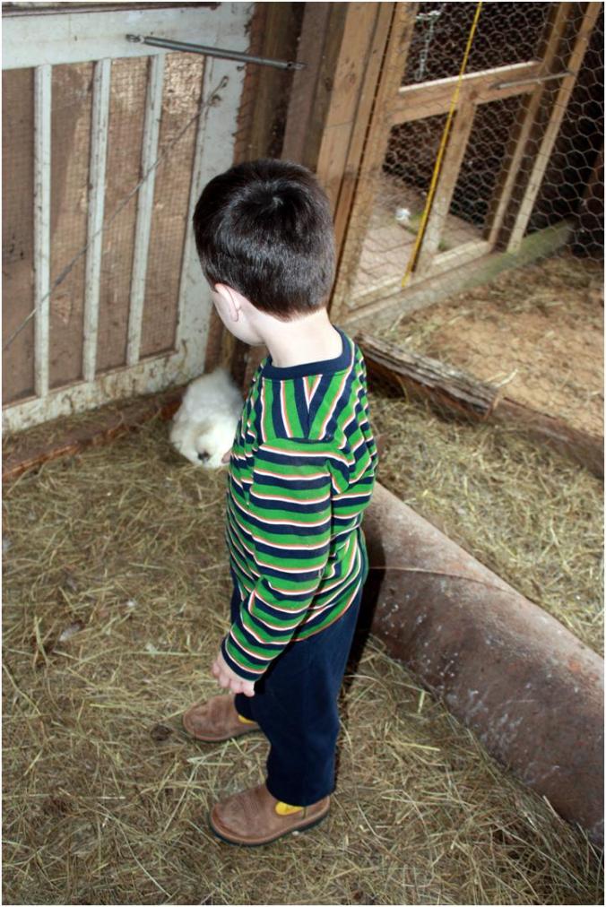 Next, we took care of the little chickens and rabbits. When it was time to feed the other chickens, the boys were a little hesitant.