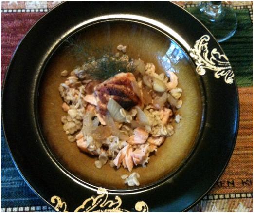 When the salmon is done, pull it apart with a fork, incorporate it into the oatmeal along with the onions and garlic. Then garnish if you like. I used fennel.