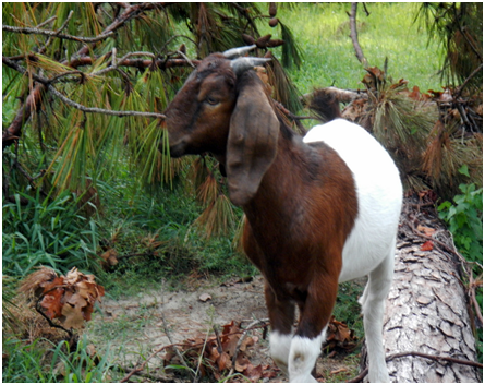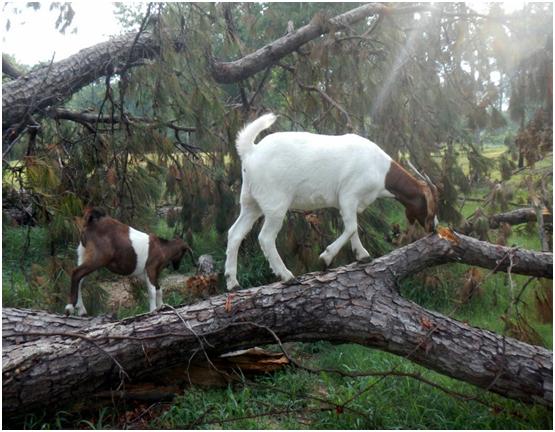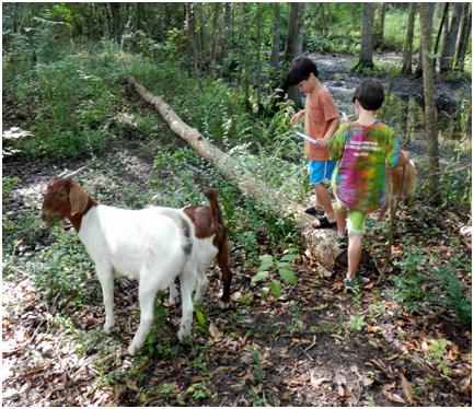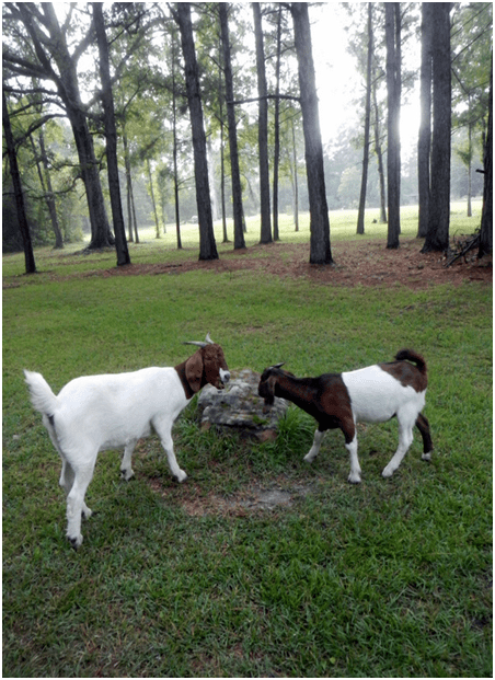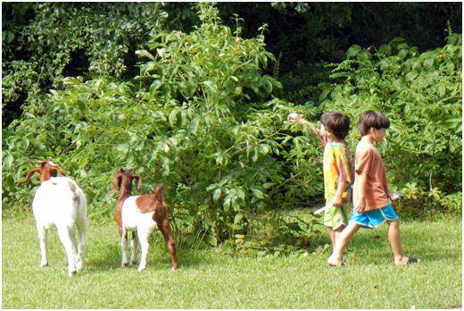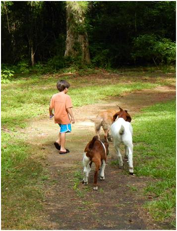 three humans, two goats and one dog.