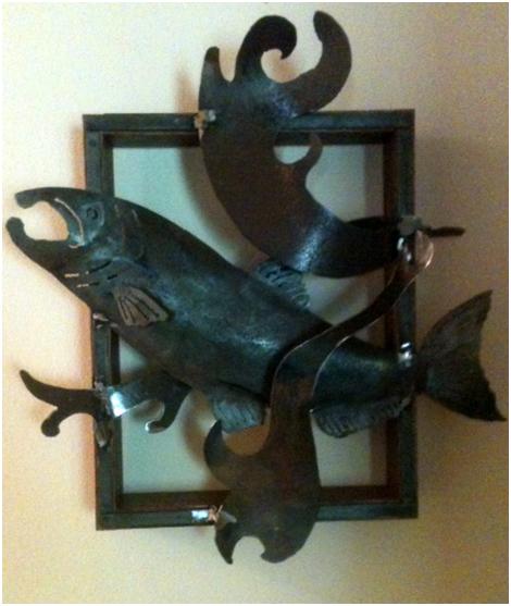 This spring, the Executive Director of Alaska Missions and Retreats, asked if I could make metal salmon. I had never done that before, but I said, “Of course!” The idea would be to sell the pieces to make money for Alaska Missions. So, Shawn and I began to collect materials for this ‘salmon art’.