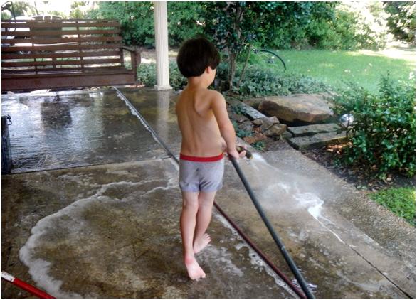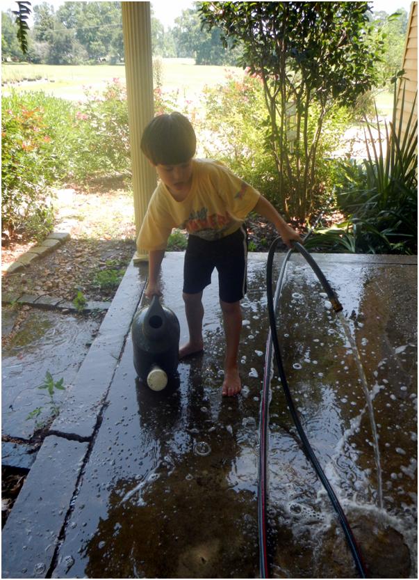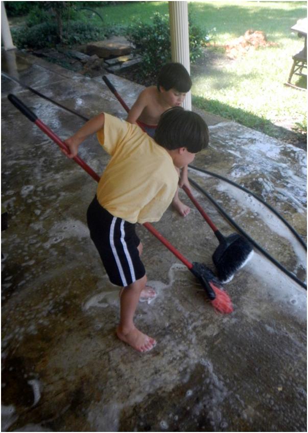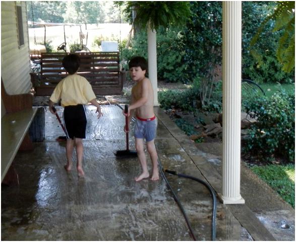 One day last week the boys spent the afternoon with me. My train of thought was to work them to the point that they couldn’t help but take a good nap. So I asked them if they wanted to scrub the front porch, knowing all the while that their answer would be yes.