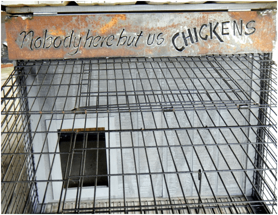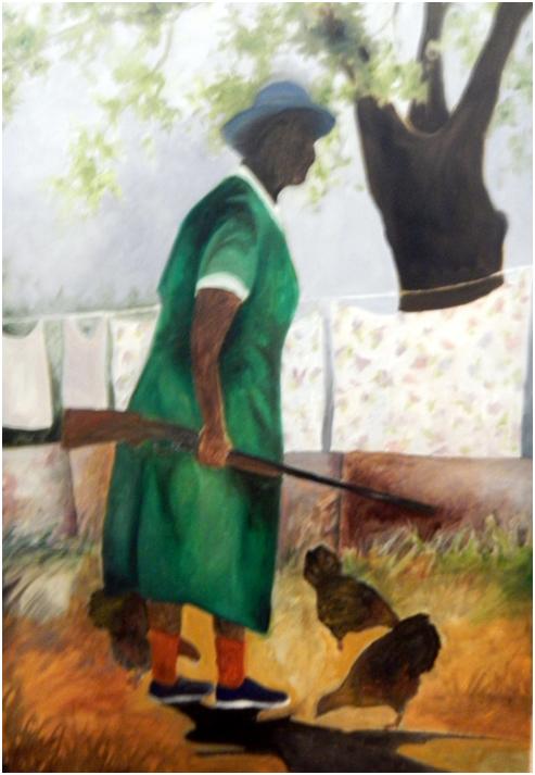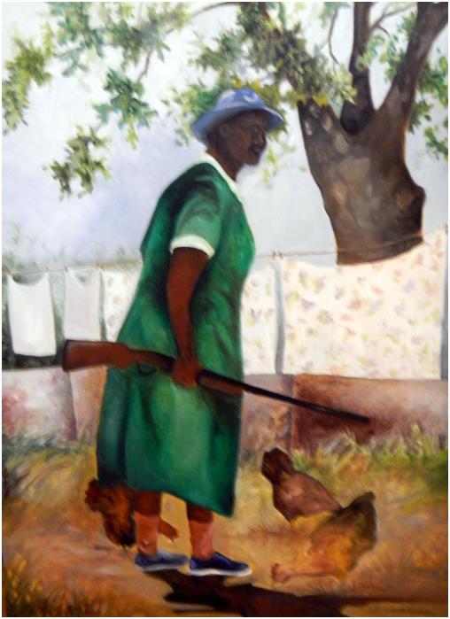 It’s a painting of an old black lady walking through her chicken yard with a shotgun in her hand,