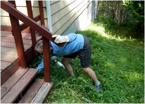 We reported to Salmon Frenzy Headquarters to find a sanctuary full of people singing worship songs together. We found seats and joined in. After the singing there were introductions and some housekeeping items were discussed. Then it was time to break into groups for orientation. Since we didn’t come with a group, we followed one of the staff members and asked him where he wanted us to serve. He told us that this was the largest group that they had had, and asked us if we knew anyone in the community who might need work done. Our thoughts immediately went to “the Grouch” down at the B&B and we said, “Yes!”