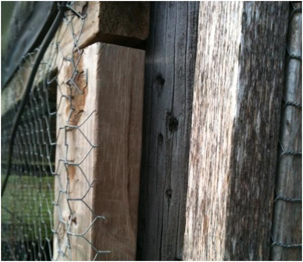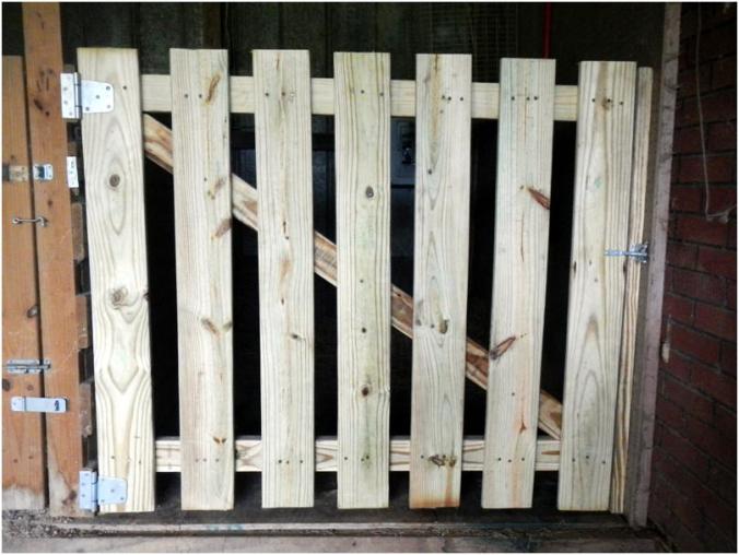 The things that the gate hung on had to be screwed into a 2 x 4 (part of the frame for my chicken pen) that was nailed to a pole. When the hanger went through the 2×4 to the pole, it pried the 2×4 loose at the top – which meant that I was going to have to take the gate off, unscrew the hanger, reattach the 2×4, and drill the hole deeper.