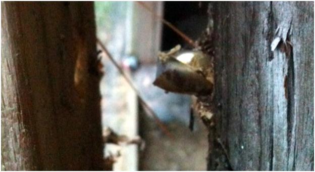 So this morning, I collected my daddy’s portable drill and went down to make another lap with the gate. I took it off the hangers, took the top hanger out, nailed the 2×4 back to the pole, and drilled the hole deeper. Everything was going like clockwork until