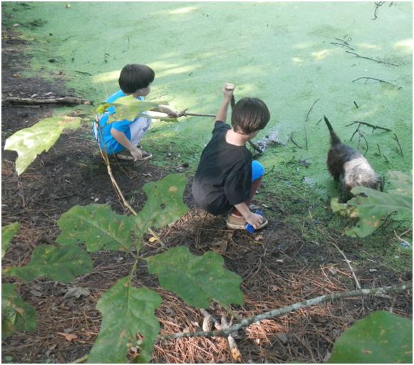 On the back side of the pond, Porter and the boys took a few minutes to stir in the duckweed before heading up the hill to “Pawpaw Rock”.