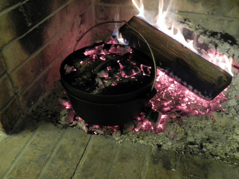 It has rained ALL day. I went to the market at Inglewood Plantation to get vegetables in the rain. I fed the animals in the rain. I don’t like to clean house when it rains, so I decide to entertain myself by doing some open hearth cooking. To tell you the truth, it probably wasn’t cold enough to have a fire. But, you’ve gotta eat. Right? I decided to cook a small loin roast. While the roast was thawing and the fire was making some really good coals, I went out to the shop to construct a make-shift tin oven.