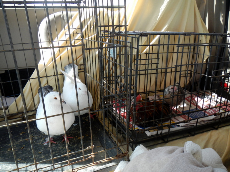 While we were there, Joe talked me into taking home a pair of pigeons. In the past, Joel has said, “Susan, whatever you do, just don’t bring home any pigeons”, so I was a little nervous. Joe and I caught the pigeons, put them in a cage, and set them on the back seat of Judy’s truck
