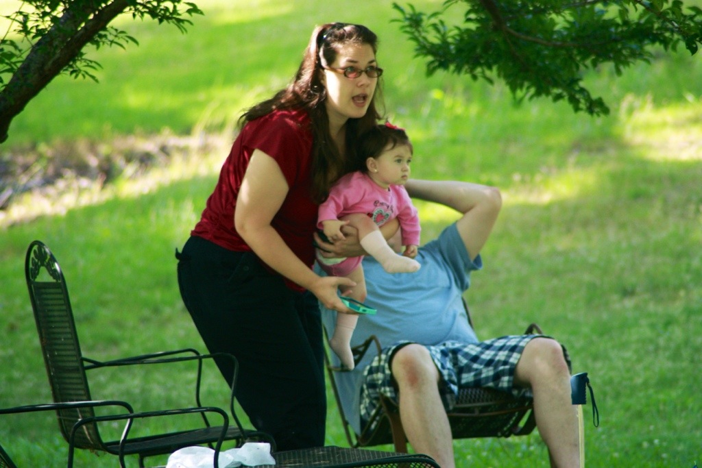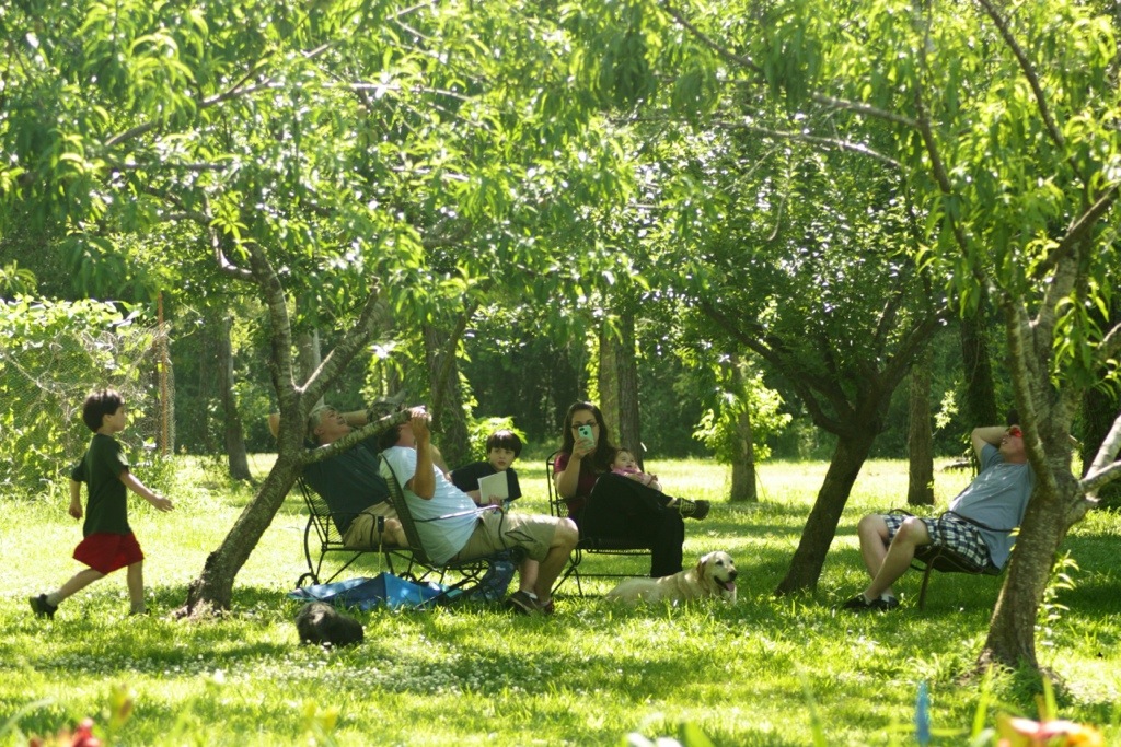 Nikki and Josie went out to sit in the shade of the fruit trees. The boys, who are not slaves to fashion, were there too,