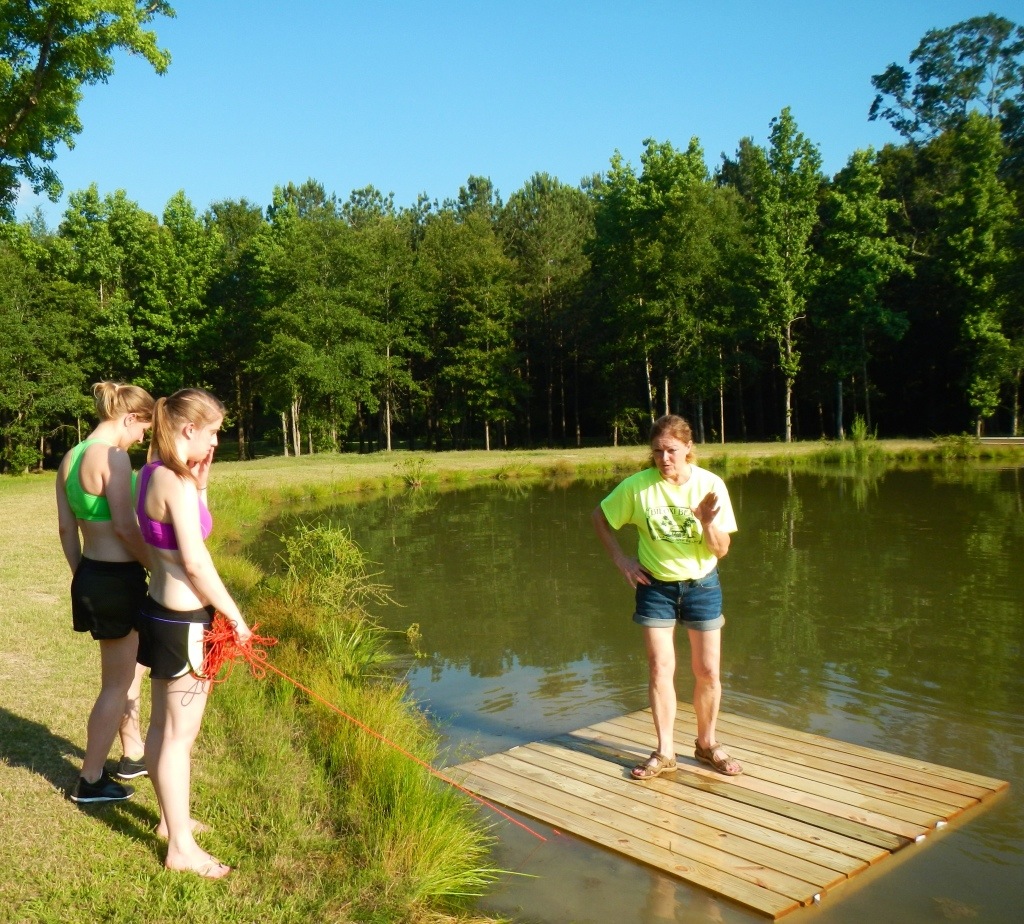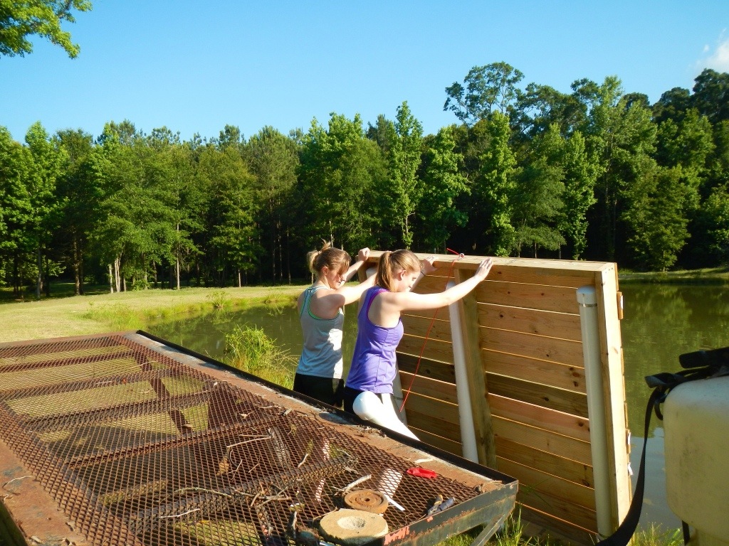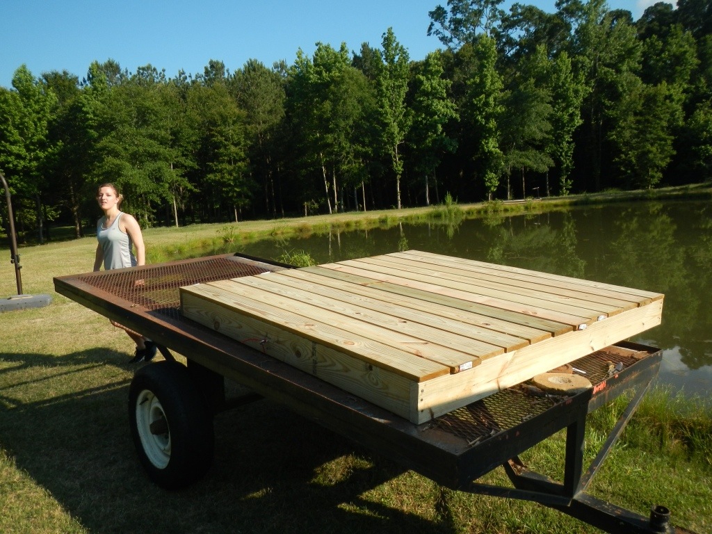 and she helped unload the deck. Then Donna, Katie, Lyndsey and I shoved it out into the pond for its maiden voyage…and guess what?