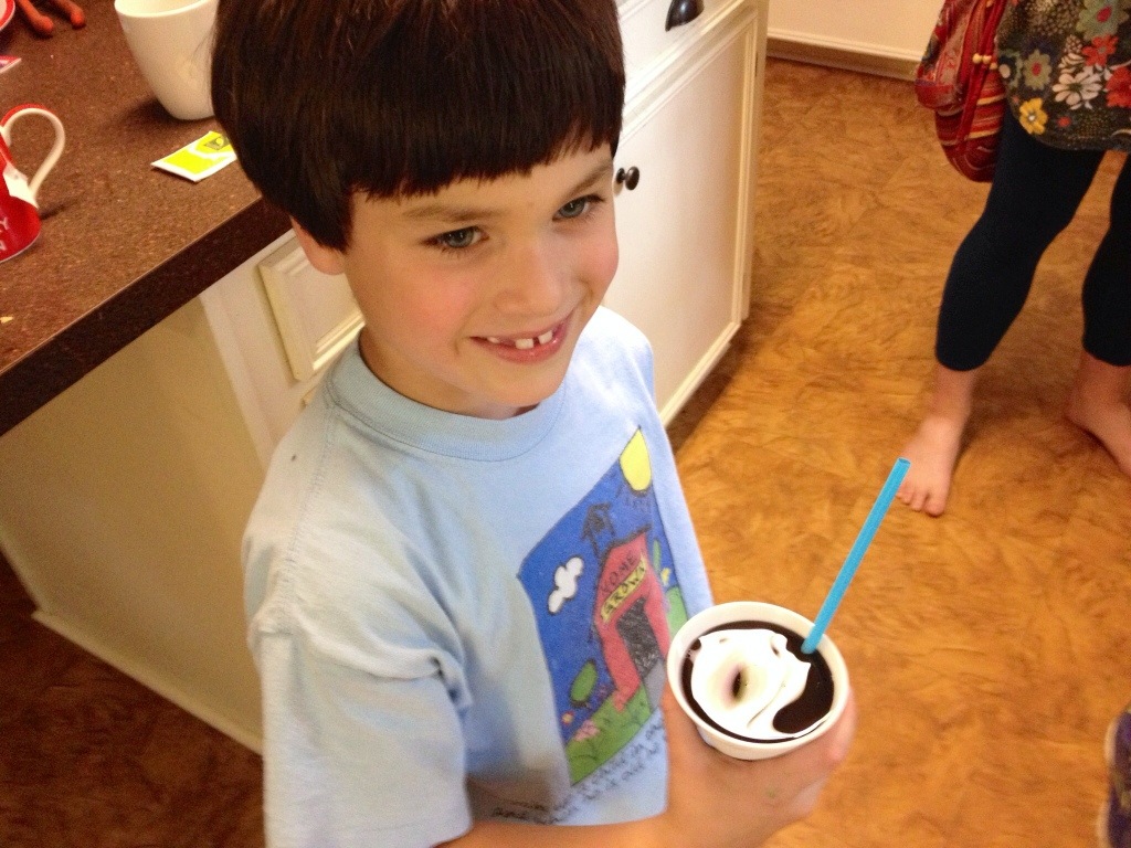 to make them each a snow cone. After she got the ice ready, I helped Hudson build his snow cone. Then I turned to help Denton, and out of my mouth came, “Wait, what have you done?”