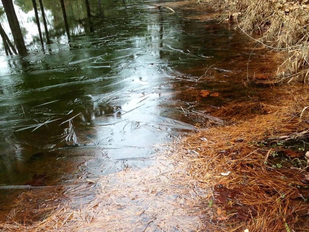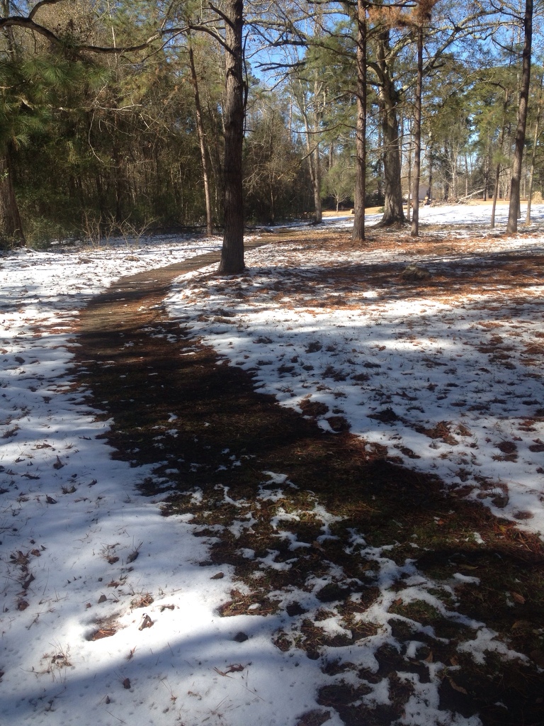 For one thing, two days with snow on the ground is sufficient for me. For the other thing, if you have to walk a quarter of a mile in the dark, over the meadow and through the woods so your dog can pee, the ground seems to show up a lot better when it’s covered with snow.