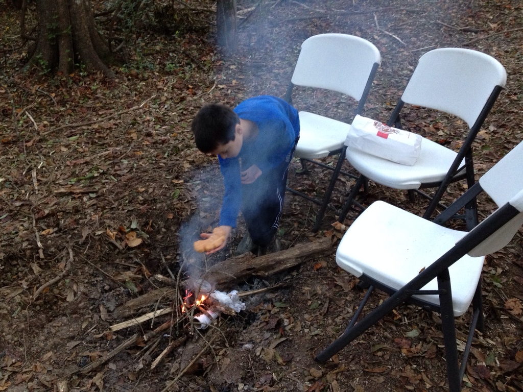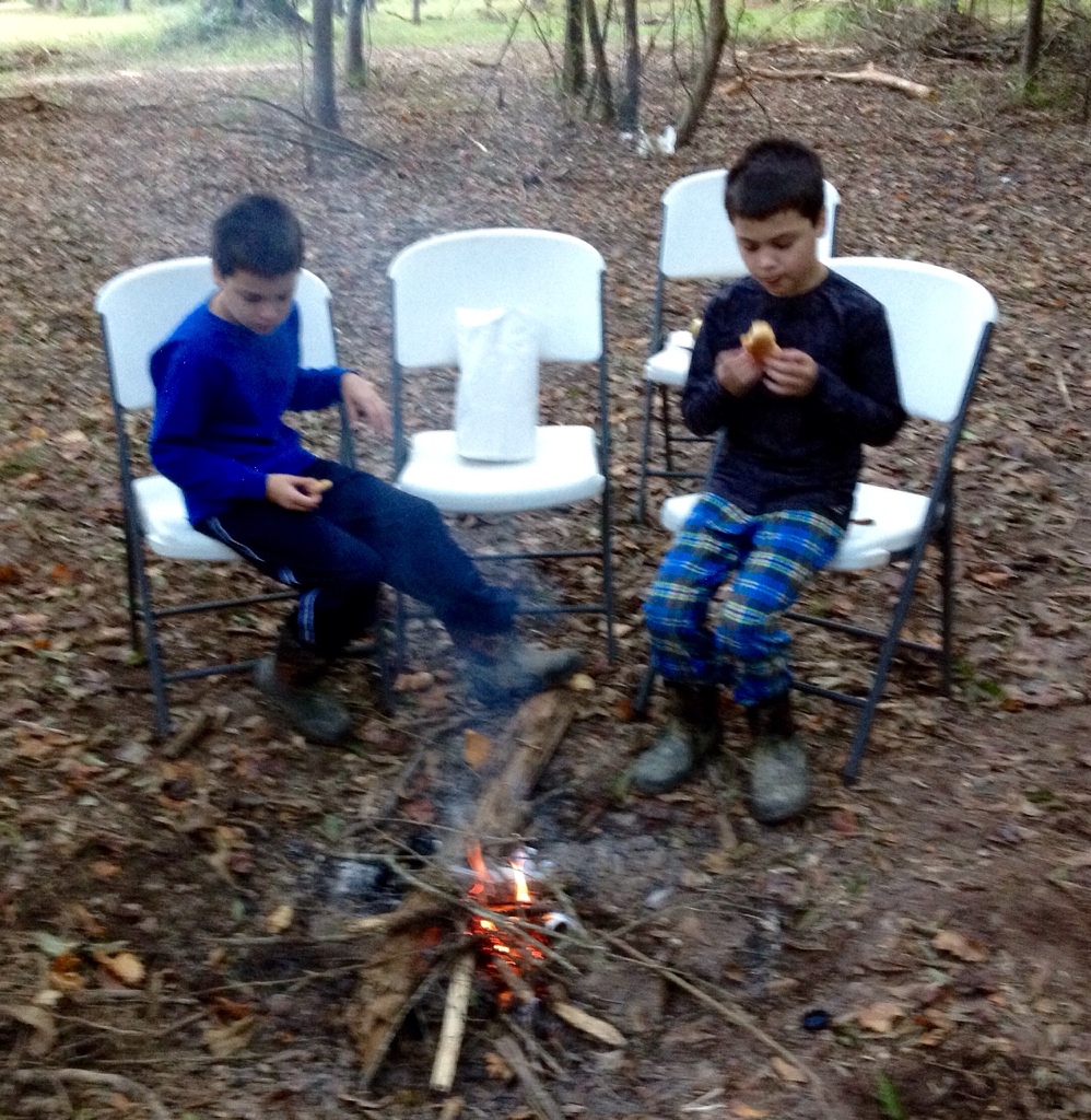 Saturday morning we picked up bear claws for the boys’ breakfast, and they wanted to eat where we had had the weenie roast the night before. The coals were still hot,
